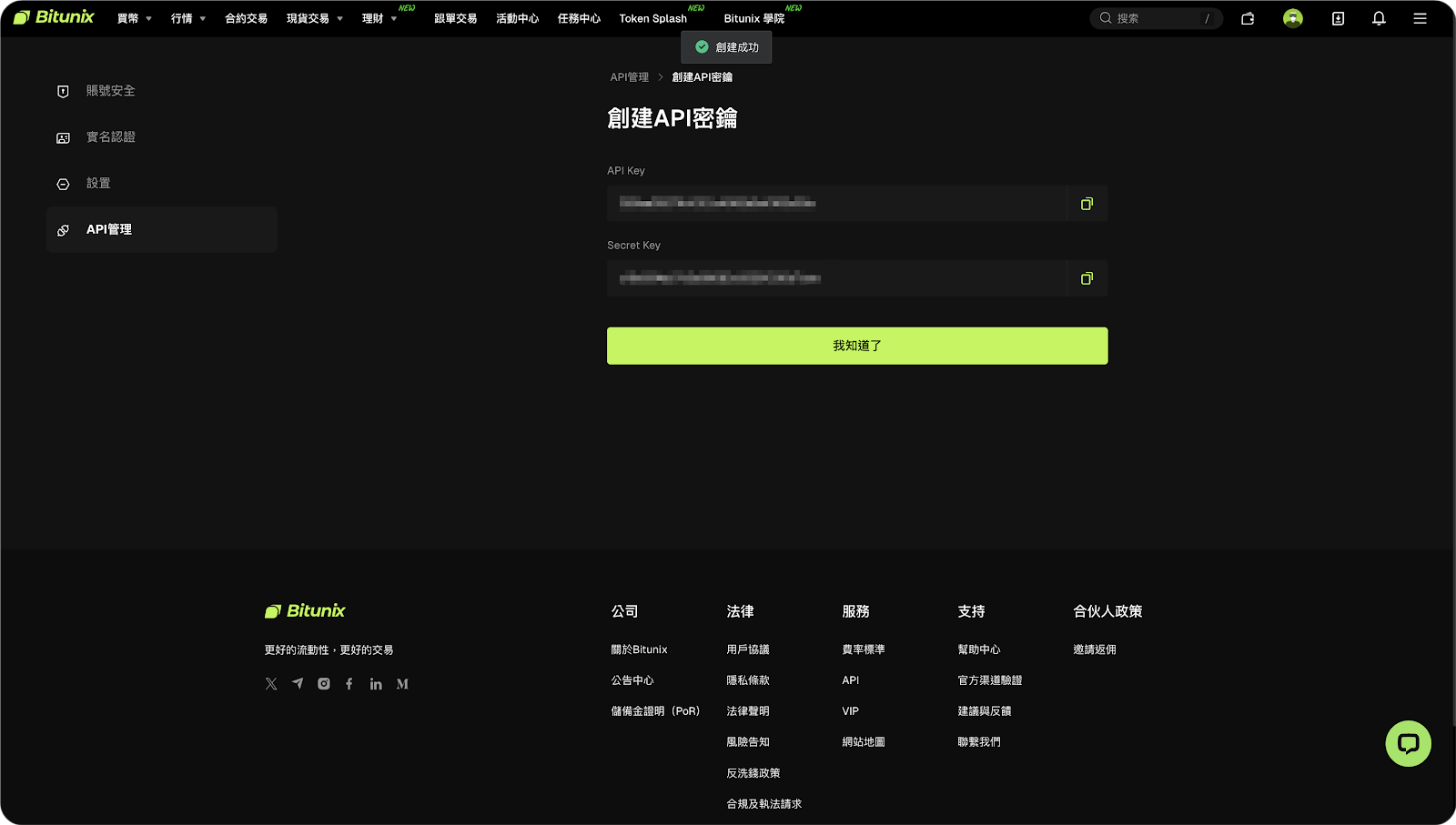 - 點擊「提交」,完成後將顯示 API Key 與 Secret Key,建議提前複製並做好備份。